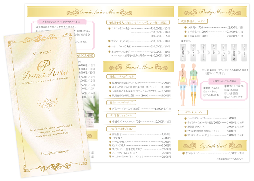 エステサロンのメニューリーフレット(三つ折り)をデザインさせていただきました